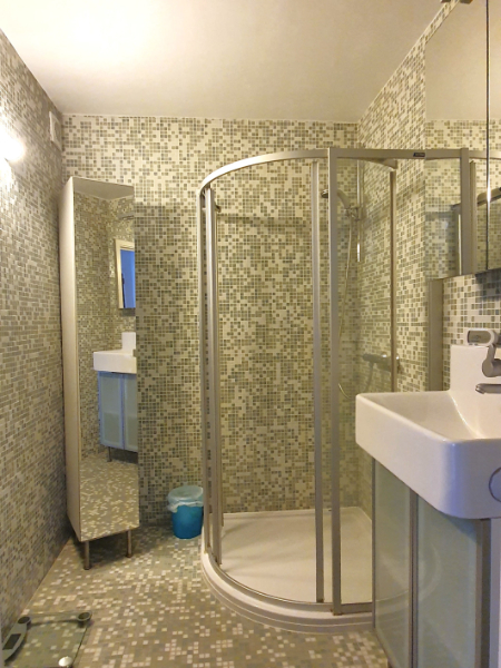 Apart toilet, bergruimte, badkamer met douche en lavabomeubel en twee slaapkamers.